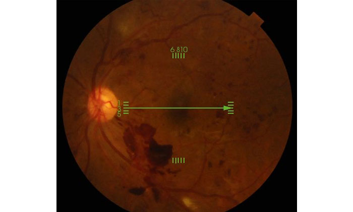 血糖値が高いと、血管がもろくなり血液成分が漏れ出し、網膜に出血や視力を司る黄斑部に浮腫(水膨れ)が生じ視力が低下する病気です。悪い血管(新生血管)が出てきたり、さらに悪化すると増殖膜(普通にはない膜)が発生し、網膜を引っ張り網膜剥離に至ることもあります。 症状は初期は無症状ですが、網膜病変が進行するにつれ視力が低下します。硝子体内に出血すると一気に見えなくなることもあります。緑内障を合併してくることもあります。 治療は、初期はレーザー治療や抗VEGF療法という目に注射をします。網膜剥離などに至ると外科的手術治療になります。